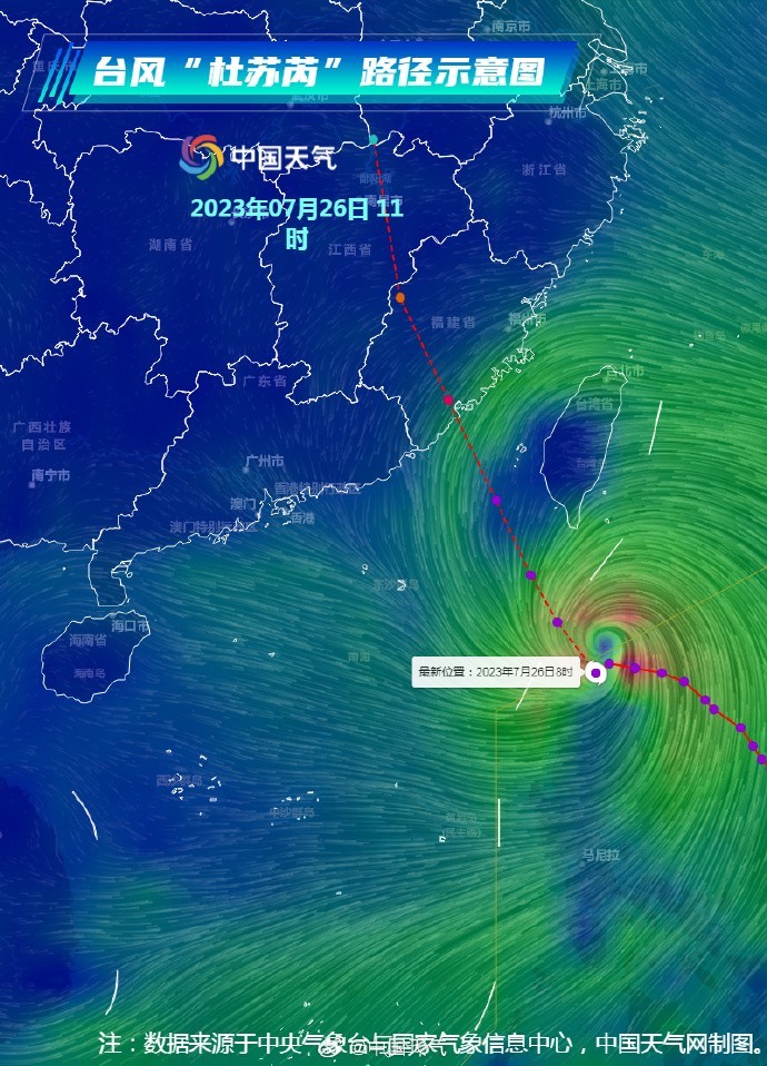 据广东省气象服务中心消息,7月26日11时,台风“杜苏芮”中心位于距离台湾鹅銮鼻偏南方向约325公里的巴士海峡海面上,也就是北纬19度、东经121.1度,中心附近最大风力16级(55米/秒),中心最低气压930百帕,十级风圈半径180公里左右,十二级风圈半径100公里左右。