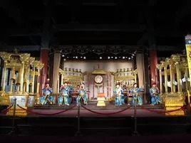 步入正殿,乾隆御笔“玉振金声”的匾额高悬上方。舞台上,灯光交相辉映,编钟、编磬金光熠熠,头戴垂缘冠、身着清代宫廷华服的演员,手执笛、排箫等朱漆云龙描金乐器,神情端庄肃穆。