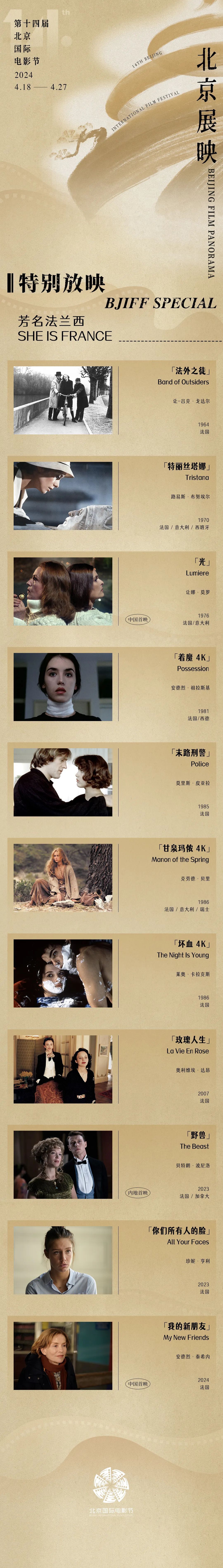 今年是中法两国建交60周年,在这60年间,电影一直以来都是两国文化交流的重要媒介与纽带。在第十四届北京国际电影节,展映单元以时间为轴,遴选出自中法建交至今最具代表性的法国女演员,每人一部代表之作,为大家倾情奉上“芳名法兰西”单元。