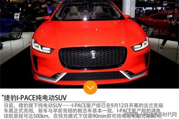 日前,捷豹旗下纯电动SUV——I-PACE量产版已在9月12日开幕的法兰克福车展正式亮相,新车与早前亮相的概念车基本一致。I-PACE量产版的满电续航里程可达500km,在快充模式下仅需90min即可将电池电量充至80%。
