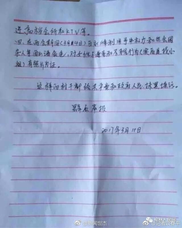 近日,多张疑似陕西榆林一村主任在KTV的不雅照流传网络。爆料者在贴文称,涉事者为横山区白界镇白界村村主任白永峰,其在“两会期间和社会闲杂人等酗酒贪色、找小姐”。