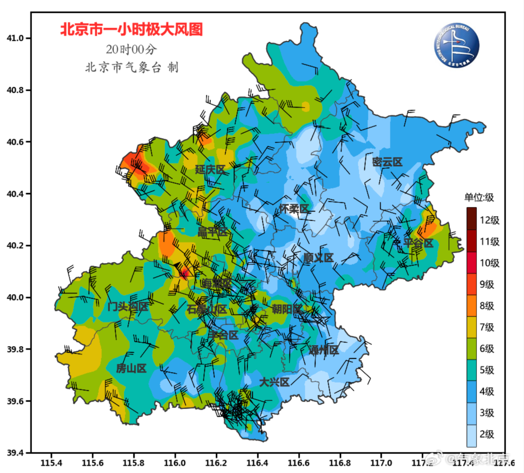 据气象北京官方微博发布,目前大风前沿已到达城区,东城、海淀、石景山、丰台、朝阳出现7、8级阵风。截至20时全市最大风速出现在延庆区小海陀, 30.8米/秒(11级);平原地区最大风速出现在朝阳区鸟巢冠顶东,17.6米/秒(8级)。全市平均降水量0.8毫米,最大降水出现在平谷北寨24.0毫米,目前雷雨云团已减弱消散。
