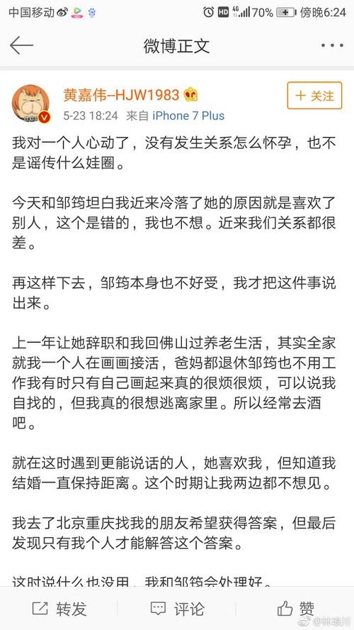 马上,黄嘉伟就道歉说,对不起老婆,发长文解释情变原因。