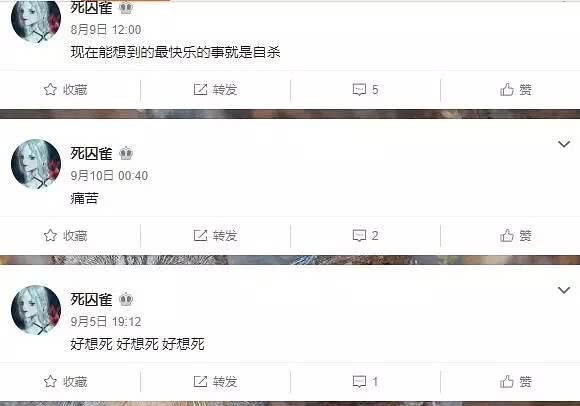 在杜雨微疑似小号微博“死囚雀”中,她发得最多的就是“痛苦”、“好想死”、“现在能想到的最快乐的事就是自杀”……她甚至还有过吃药强迫自己入睡,然后醒来不记得上一觉是什么时候睡的,抑郁的情况似乎十分严重。