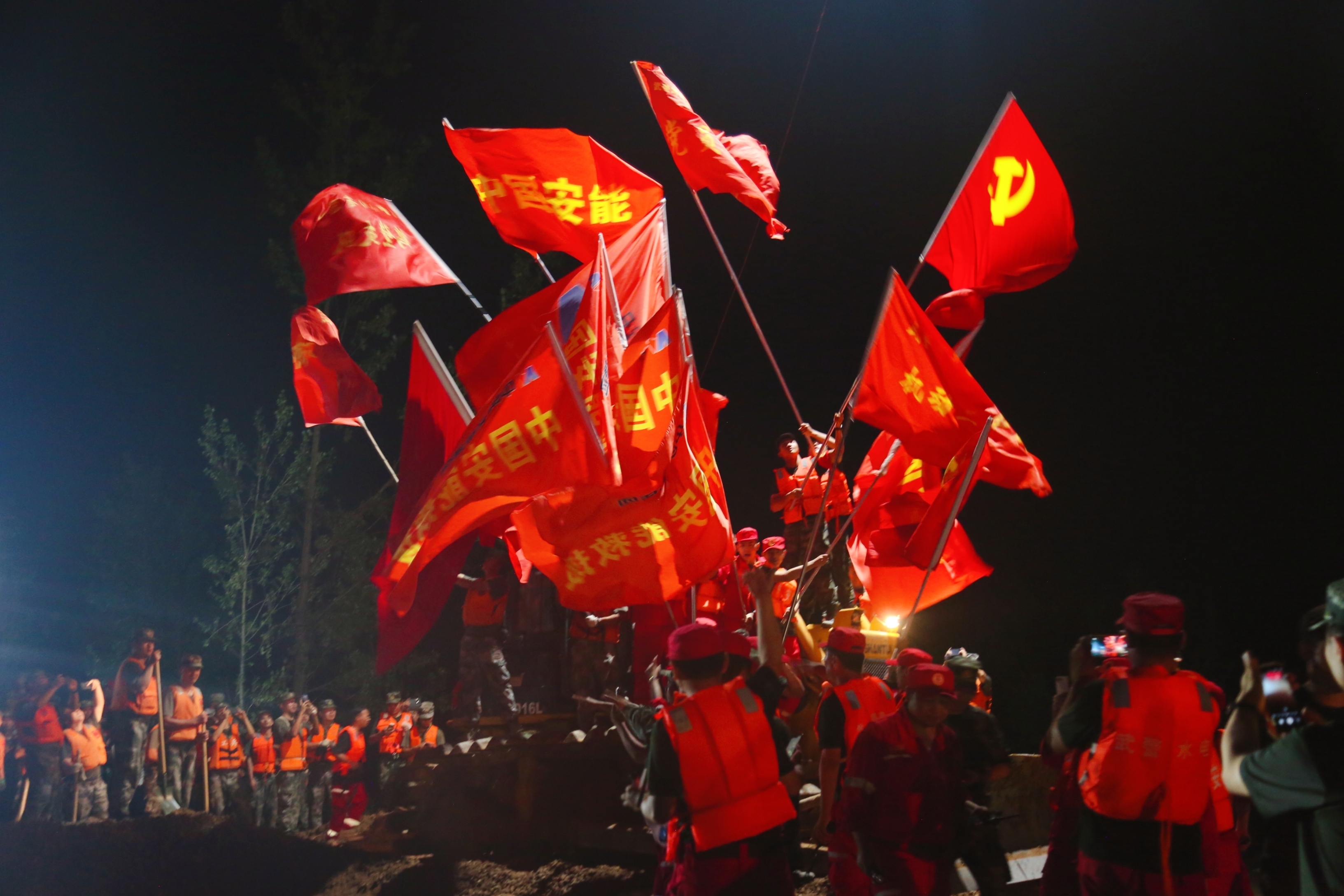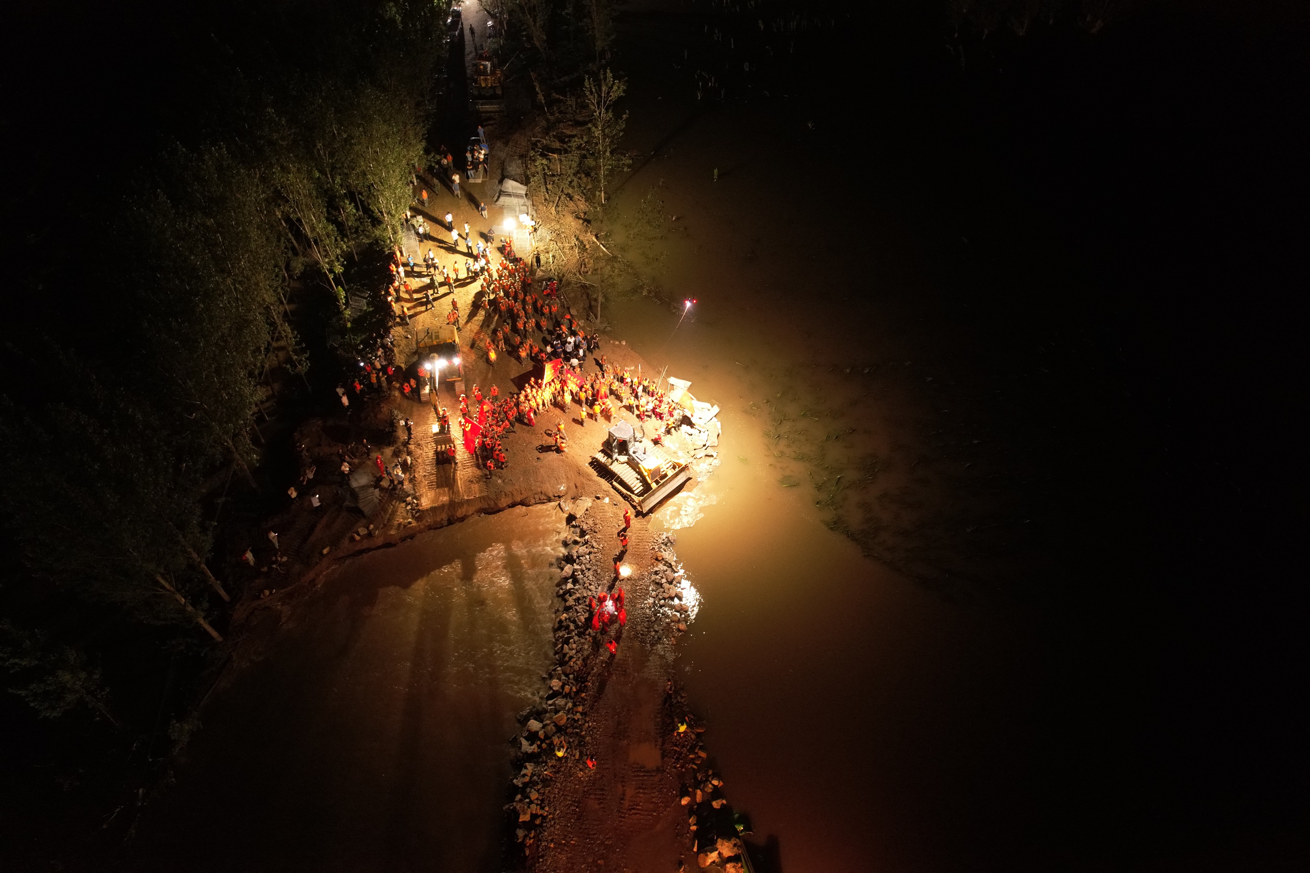 现场持续高温,当地政府组织力量抢修夯实道路、保障运输料源,解放军和武警官兵装沙袋、扎钢筋笼,为了决口早日封堵完,所有抢险人员坚守岗位、各司其职,上演了一场共克时艰、高效协同、合力鏖战的生动场景。