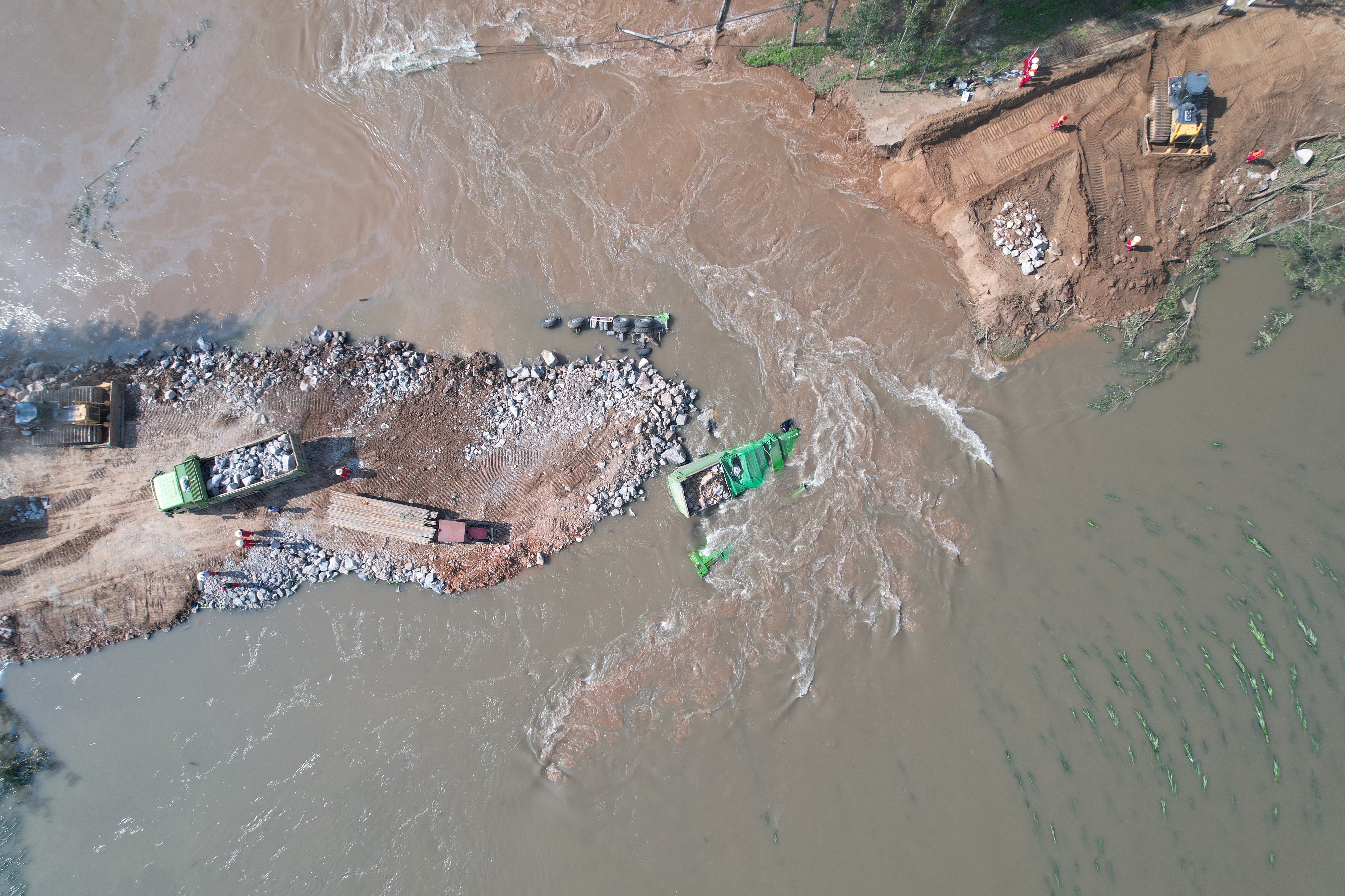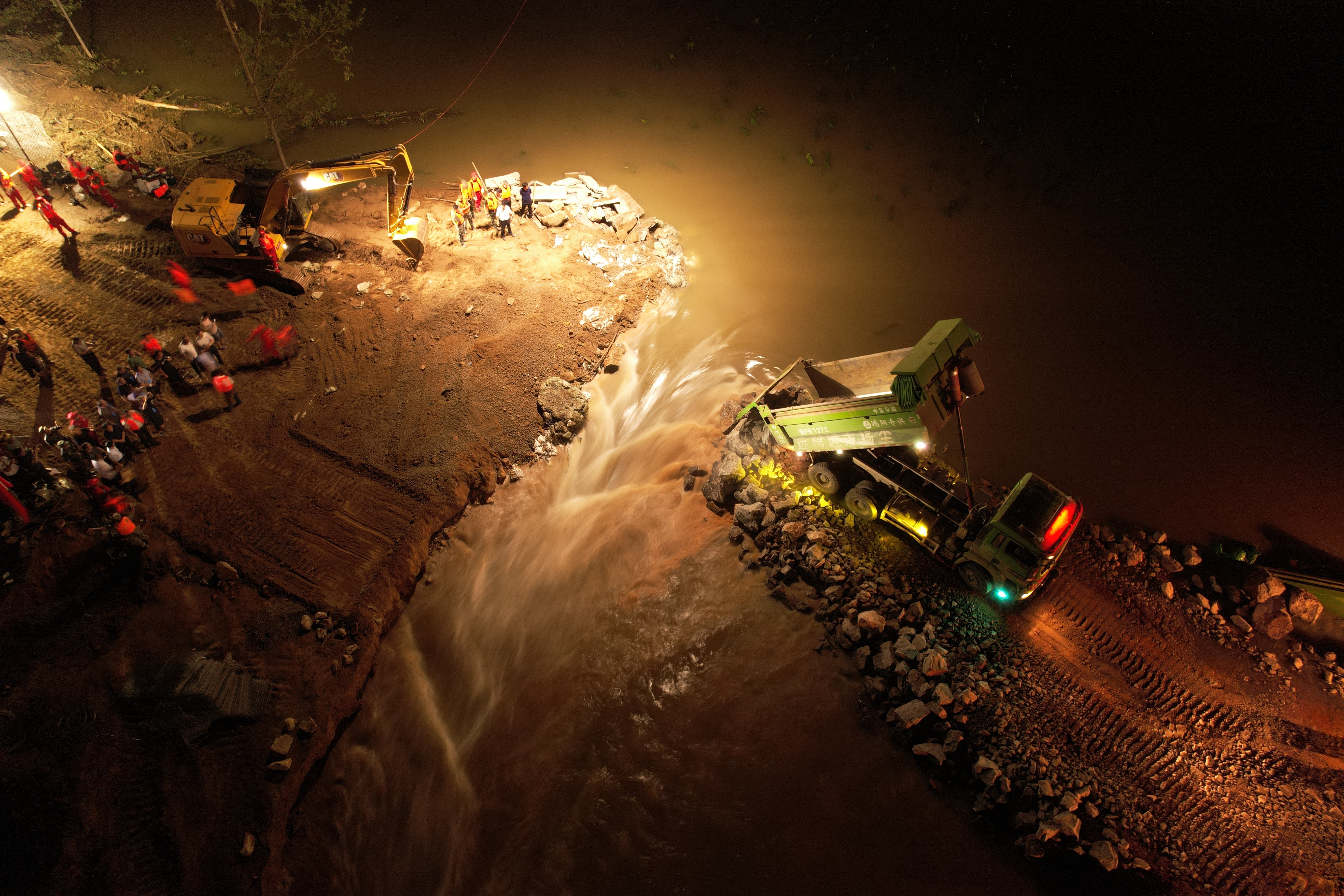 25日,决口封堵进入攻坚阶段,“5米,4米…5米…”,眼看就要合龙了,对岸再次发生垮塌,已经缩小的龙口一次次被强劲的水流冲开,刚卸载的填满石块的钢筋笼,一入水就被冲刷到几米外。