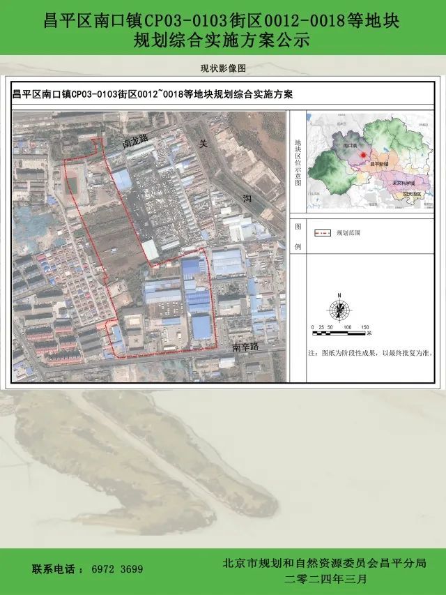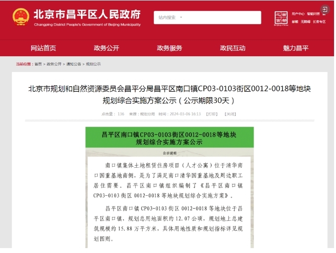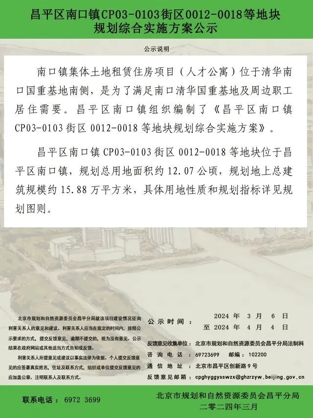 3月6日,北京市昌平区人民政府官网发布了昌平区南口镇CP03-0103街区0012-0018等地块规划综合实施方案公示(公示期限30天)。