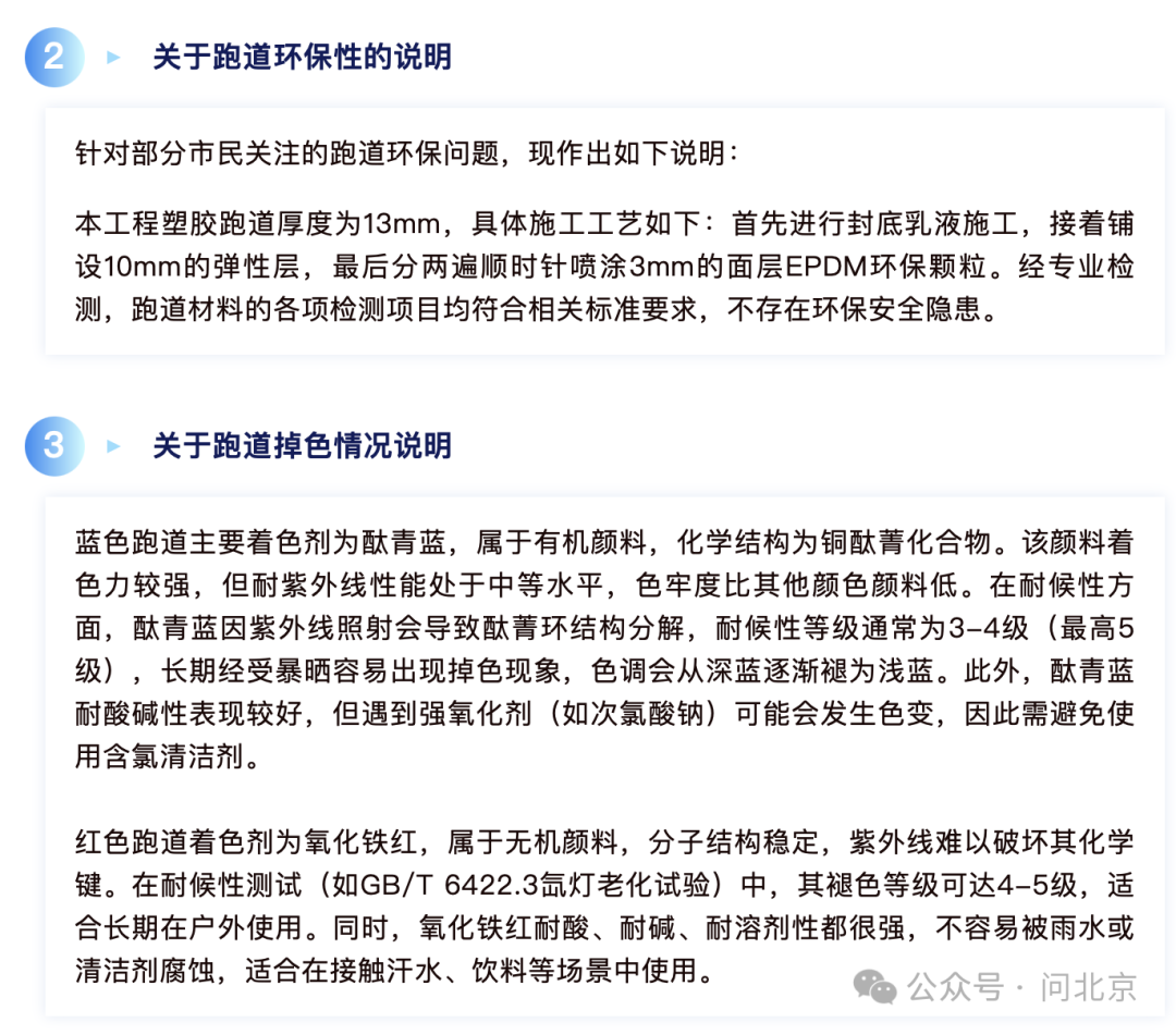 通州体育场对于跑道环保问题和掉色问题的说明/图源 通州区体育局微信公众号