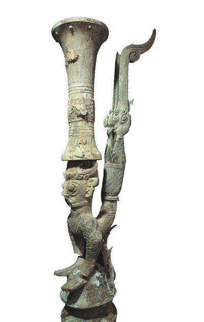 8号“祭祀坑”新发现的顶尊蛇身铜人像分为三部分,中间是一个人首蛇身、凸目獠牙、戴有牛角面具的铜人像,它的双手撑在一个带方座的青铜罍上,头上还顶着一个朱砂彩绘觚形尊,但在坑里没找到它的下半身。