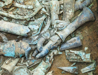 新发现的顶尊蛇身铜人像在出土时,与8号“祭祀坑”中的众多青铜残件混列在一起。新华社记者 沈伯韩摄