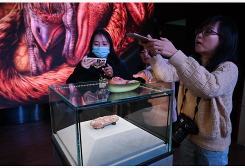 12月22日,参观者在福建省科技馆拍摄恐龙蛋化石和模型。