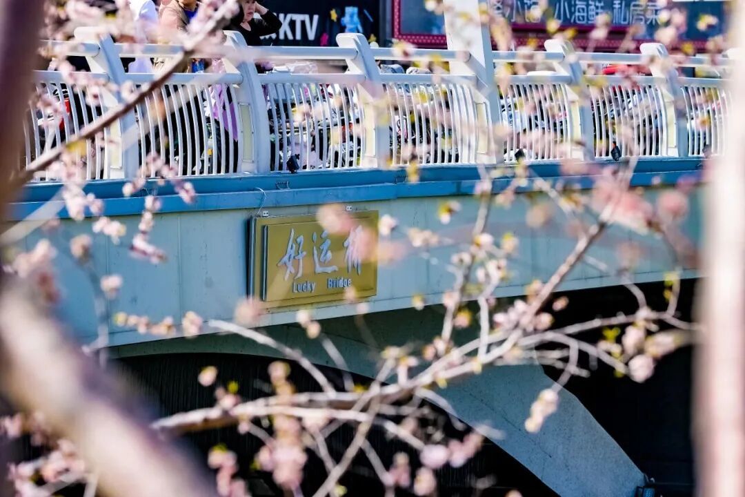 亮点:桃花枝丫探出栏杆,路边就能拍出“花拂肩头”的清新街拍,适合快速打卡。