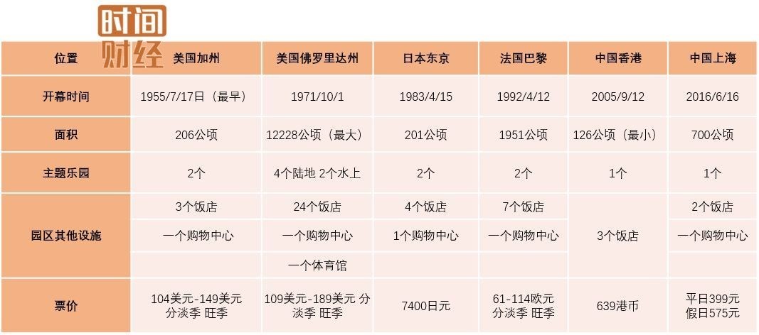 时间财经根据官网资料,整理了一下全球六大迪士尼乐园的资料。可以得出结论,香港门票价格比美国和巴黎的三家迪士尼都便宜,和上海节假日价格保持一致,略高于日本东京迪士尼价格。全球最便宜的票价是上海平日价格。