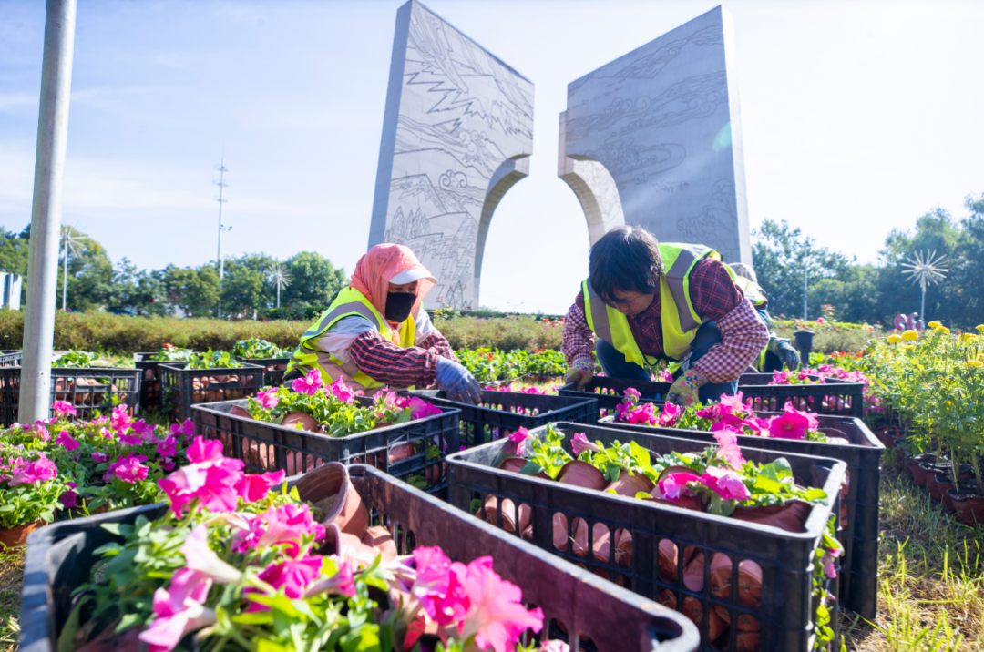 据了解,本次节前景观布置共投入17万盆花卉,重点覆盖迎宾环岛、夏都大桥、妫川广场入口及会展广场周边等核心区域。工作人员精心挑选花期适配、色彩协调的花材,通过色块拼接、图案组合等手法,让花卉景观与周边建筑、自然环境无缝融合,打造出“步移景异、花团锦簇”的视觉效果。