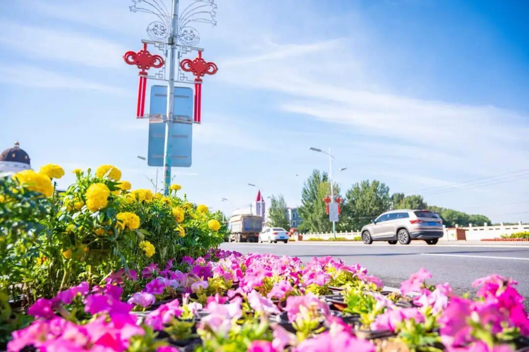 在夏都公园北门,由矮牵牛、佛甲草搭建的大型主题花坛成为街头“网红打卡点”,明黄、粉红、淡紫的花浪层层叠叠,引得过往市民纷纷驻足拍照;公园外,北京冬奥会吉祥物“冰墩墩”“雪容融”雕像被金灿灿的万寿菊环绕,既延续了冰雪记忆,也让城市的热情好客透过花丛传递。延康大桥旁,寓意“团圆迎宾”的花卉造型与鲜红的中国结彩灯相映成趣,白日花团锦簇,夜晚灯影璀璨,成为跨河而过的亮眼风景。