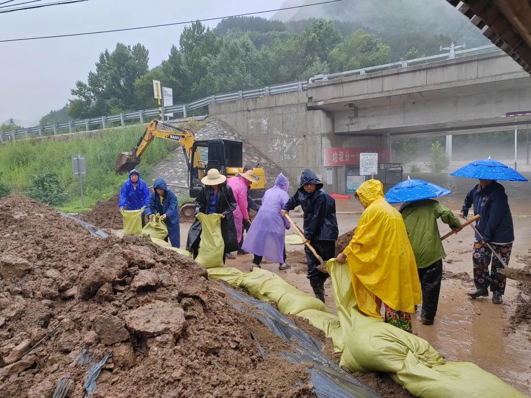 喇叭沟门满族乡对角沟门村纪检委员等村干部带领群众设置防洪设施。