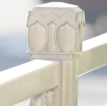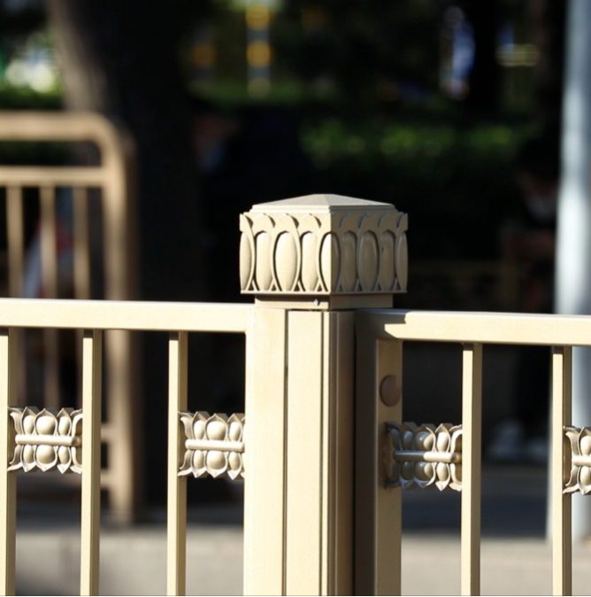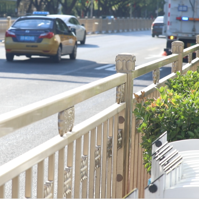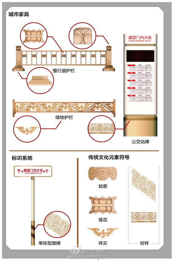 按照《长安街及其延长线公共服务设施图集》设计要求,护栏为不锈钢材质,采用氟碳喷涂为古铜色,运用如意、祥云、莲花等中国传统文化元素符号作为纹理样式。