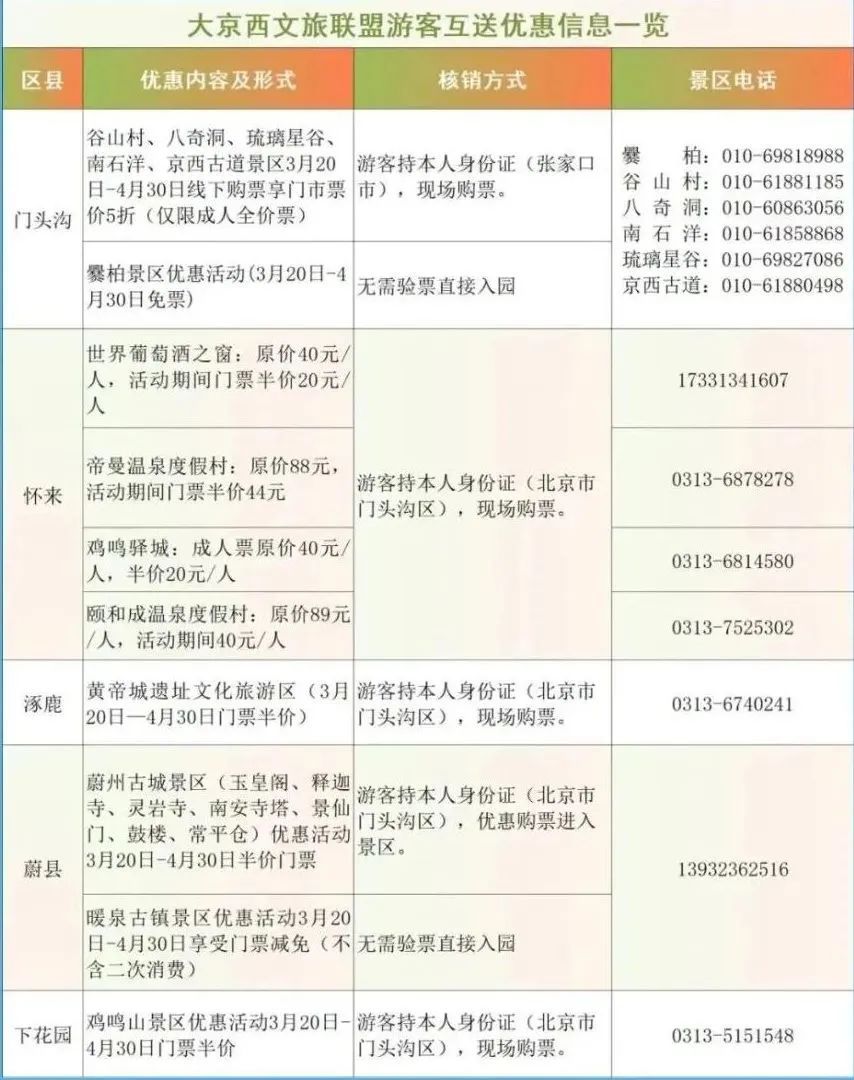 2、来自张家口市的市民游客凭身份证,在门头沟5个指定景区享受半价门票(仅限成人全价票);爨柏景区无需验票直接入园。