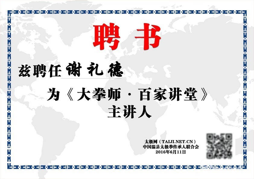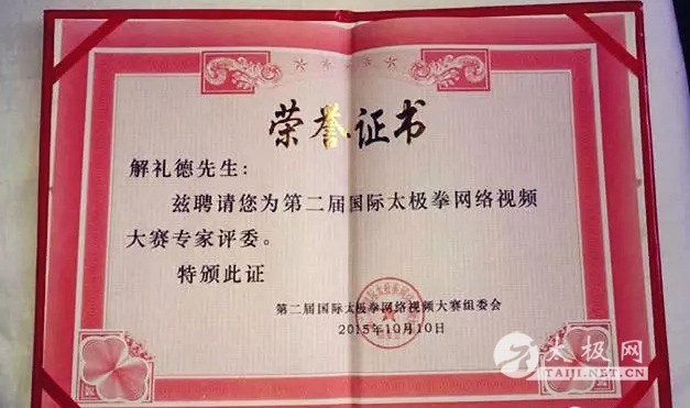 2015年10月被获聘为第二届国际太极拳网络视频大赛评委。