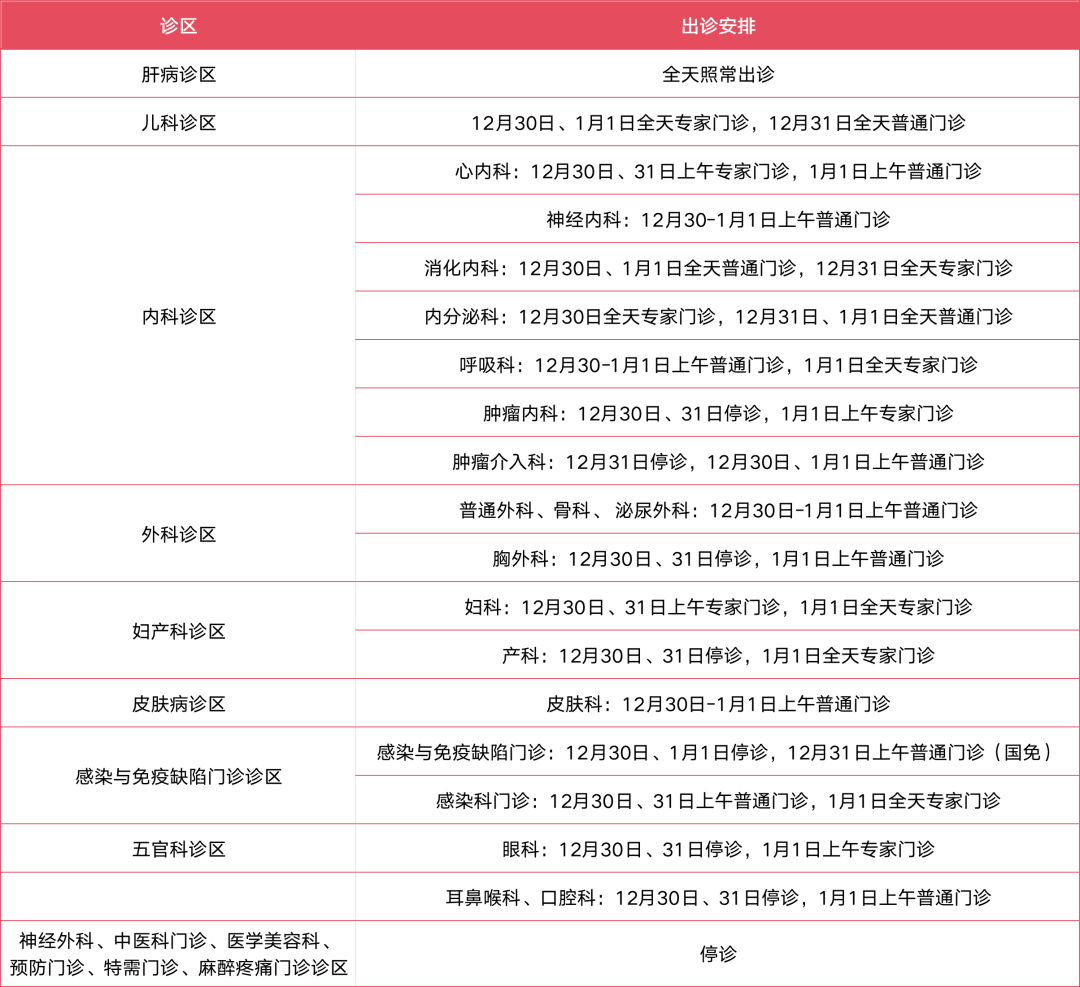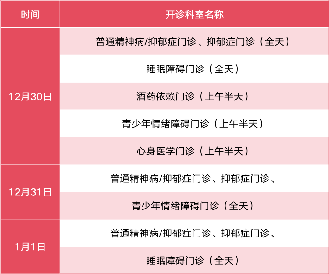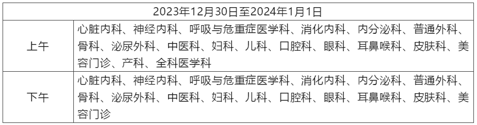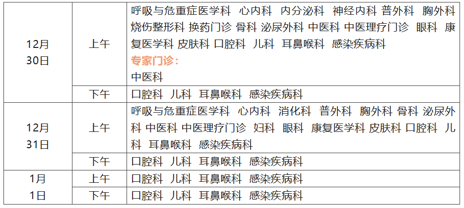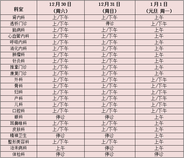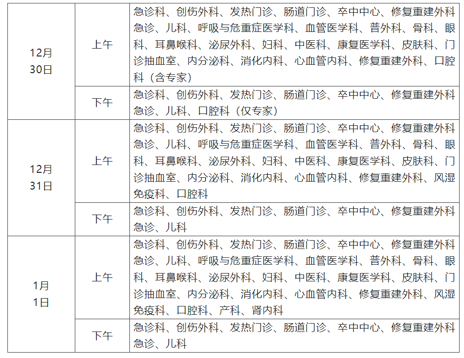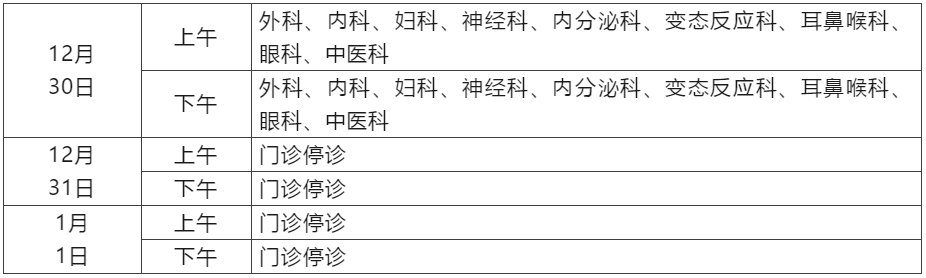 12月30日至1月1日开诊科室: