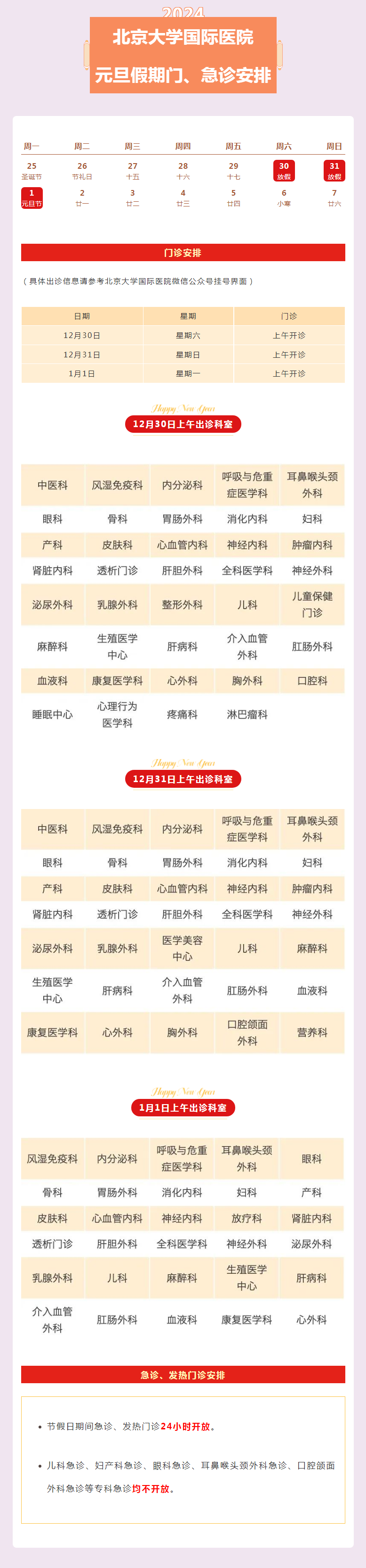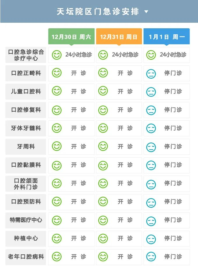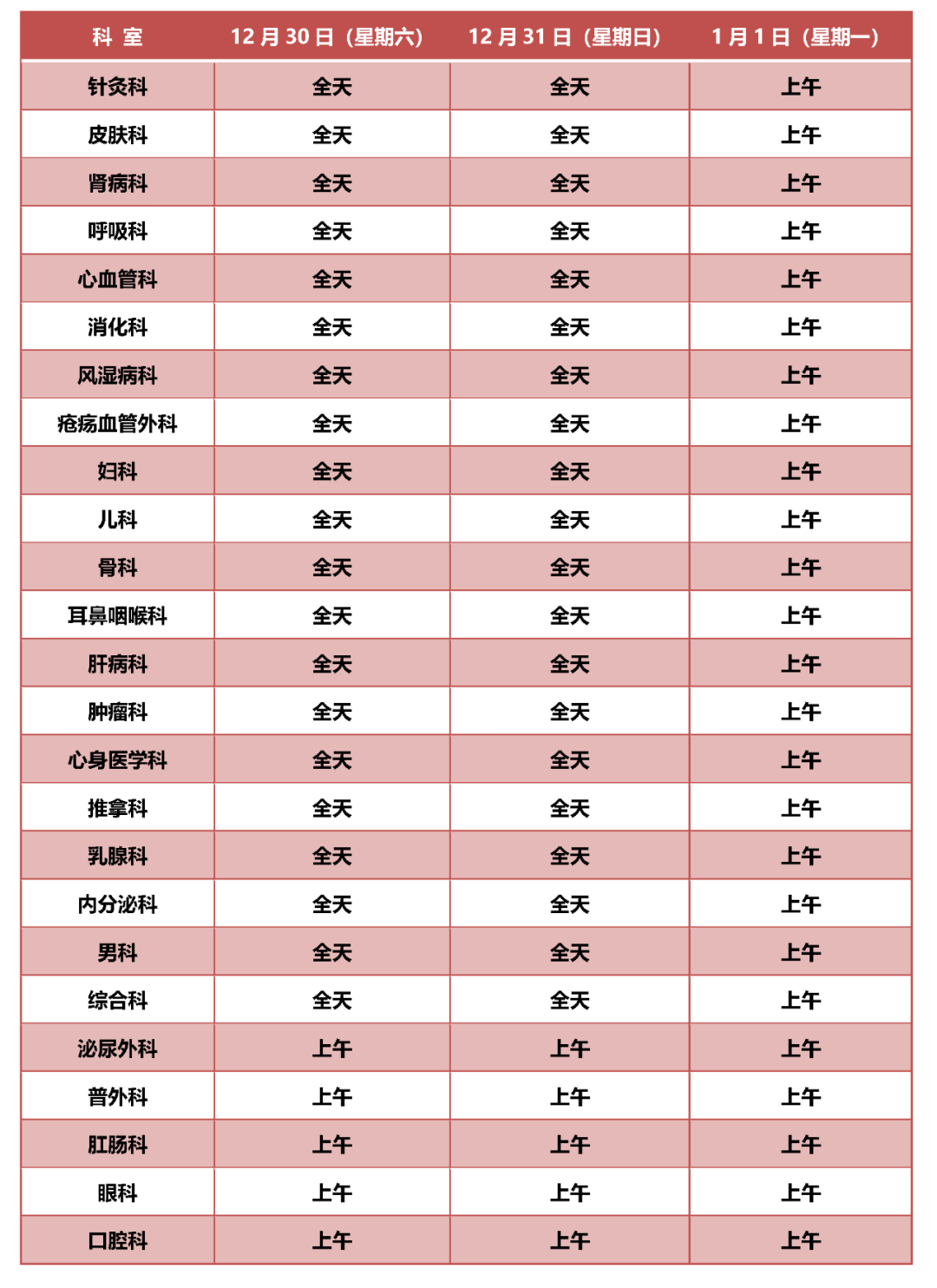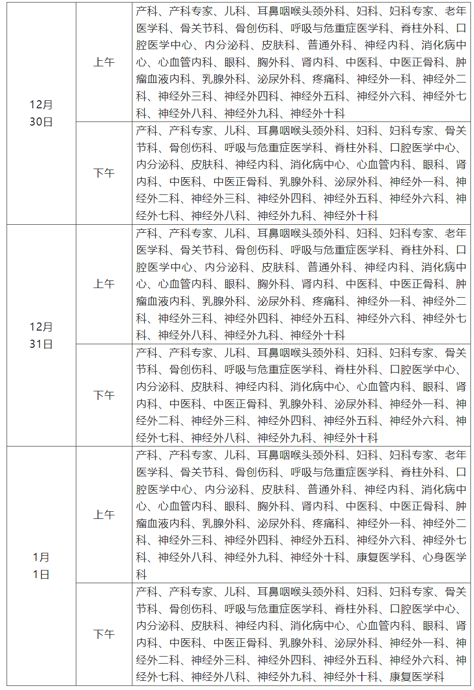 12月30日至1月1日开诊科室: