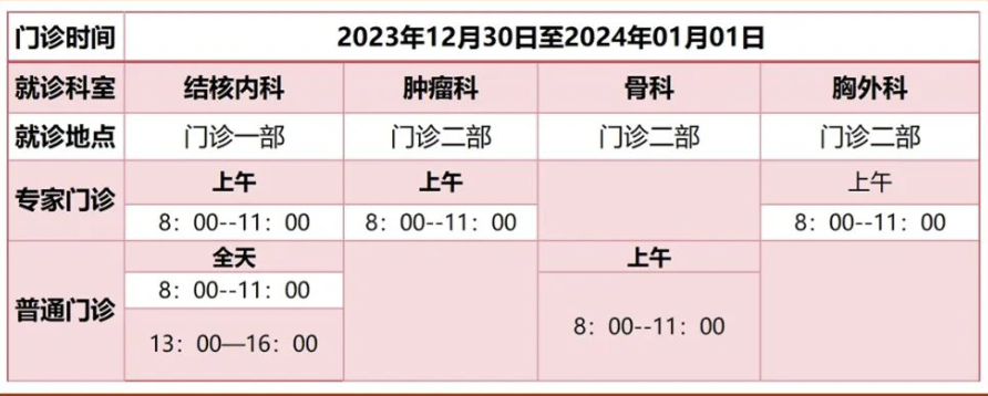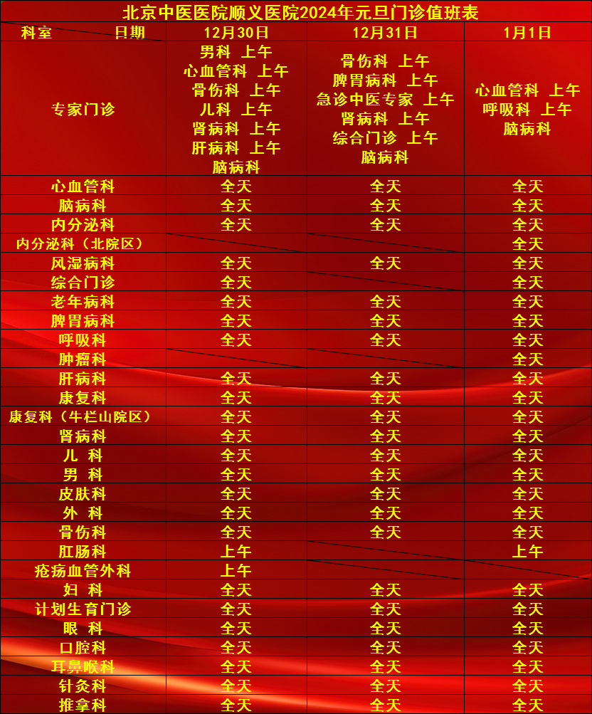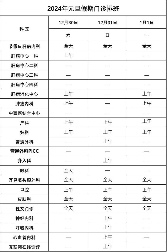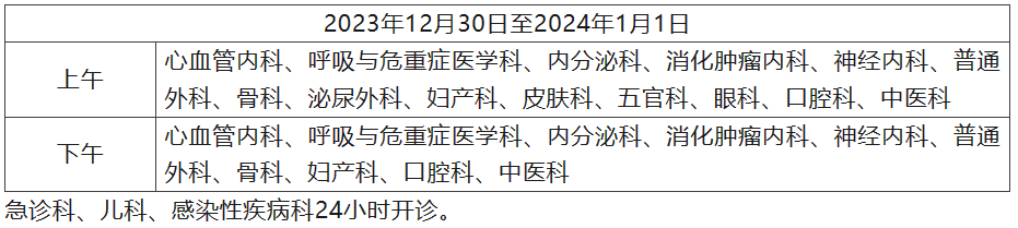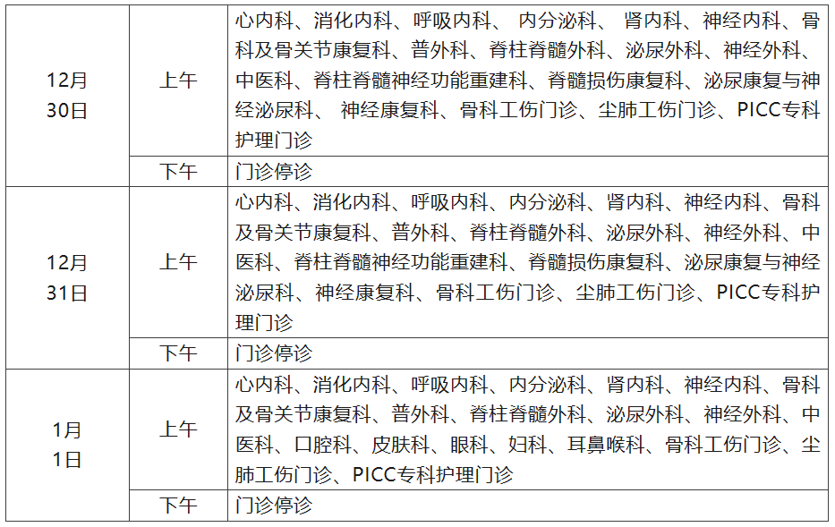 2、12月30日至1月1日,内科、外科、骨伤科全天门诊。