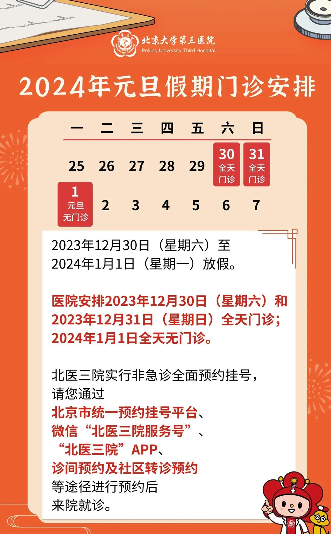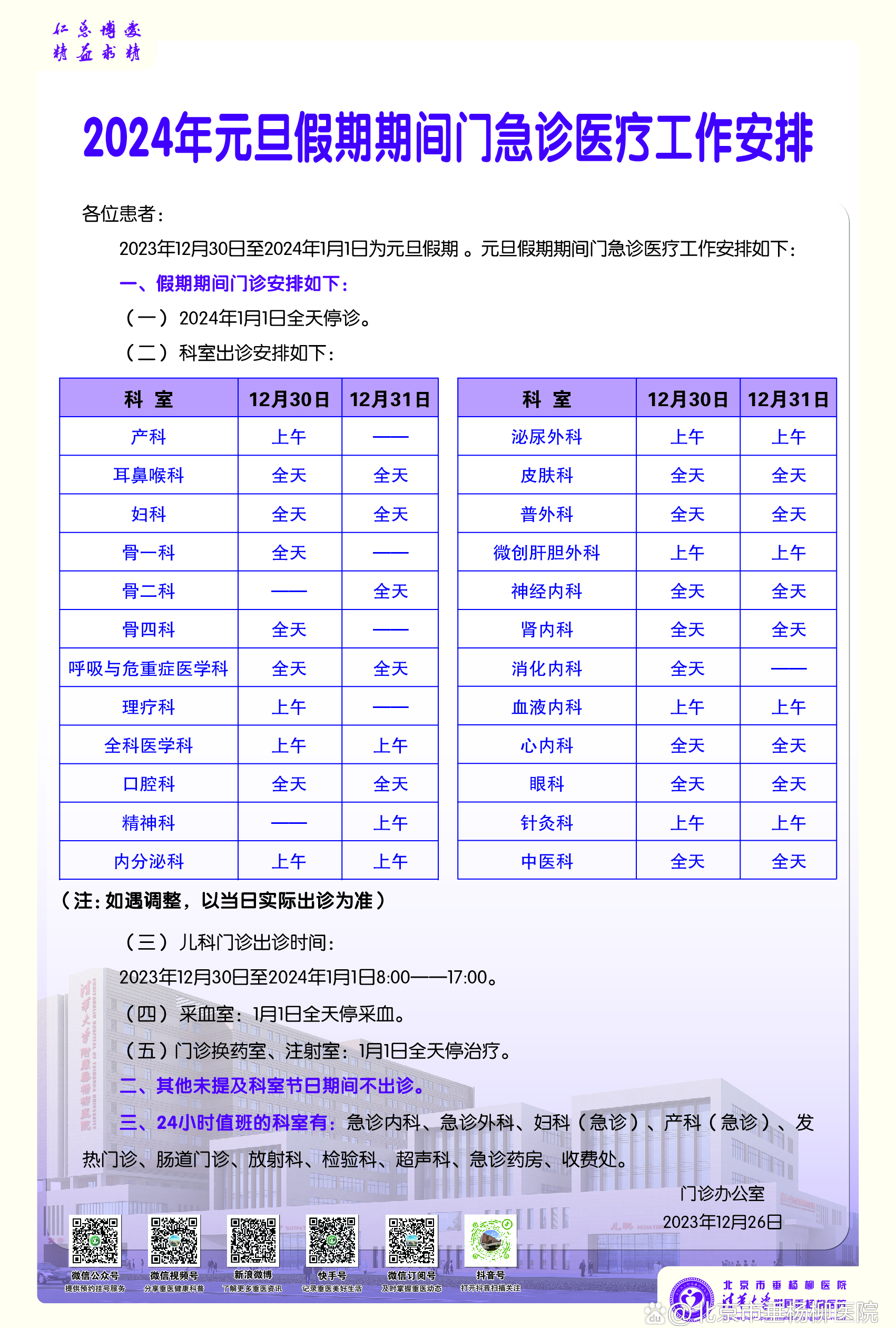 1.2024年1月1日元旦,停门诊一天。2023年12月30日、31日按周末门诊安排。
