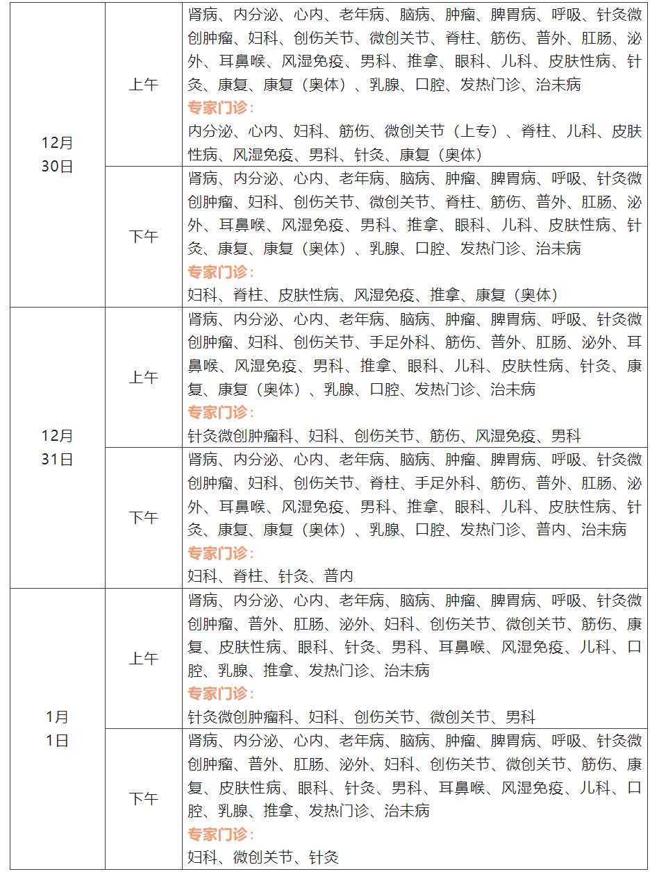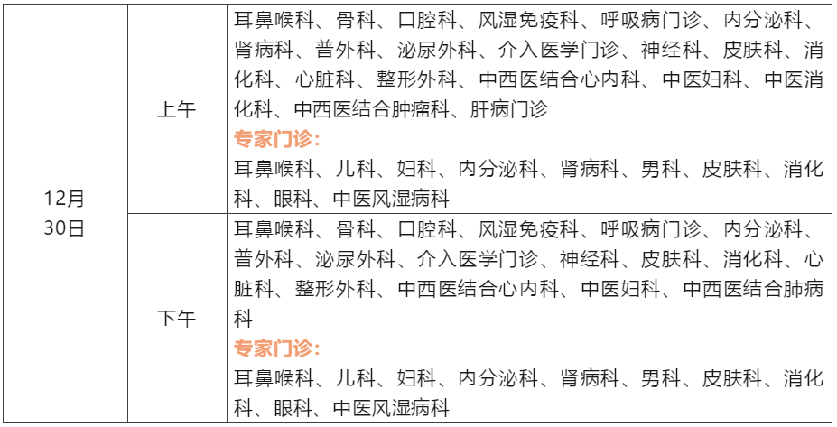 12月30日:普内科、消化内科、呼吸与危重症医学科、肾脏内科、内分泌与代谢科、心血管内科、甲状腺乳腺疝外科、胃肠外科、胸腔外科、血管外科、泌尿外科、骨科运动医学中心、肝胆胰外科、眼科、耳鼻咽喉头颈外科、神经内科、皮肤科、康复医学科、疼痛科、产科、儿科、中医科、感染性疾病科