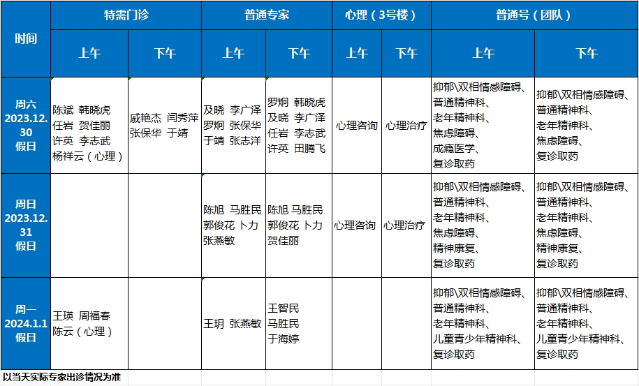 2023年12月30日至31日:正常出诊