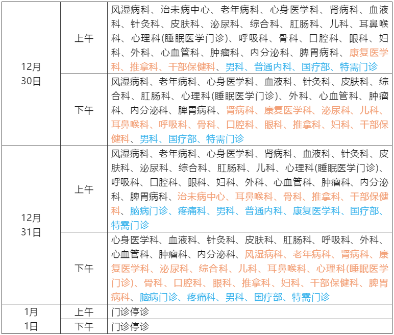 3、风湿内科、血管外科、麻醉镇痛、神经外科:12月31日上午半日门诊;