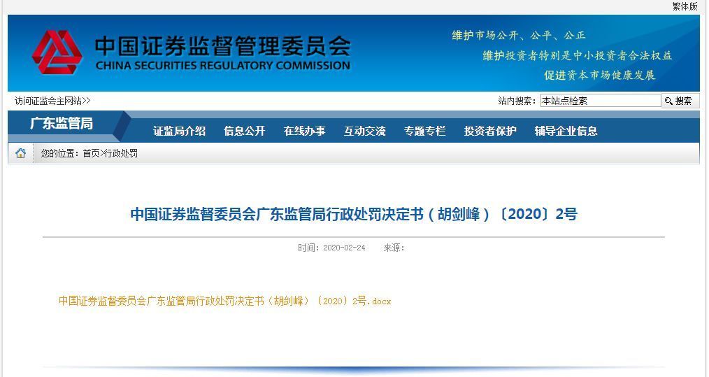 近日,中国证监会广东证监局披露了一则行政处罚决定书,涉案主角胡剑峰曾在国信证券股份有限公司广东南海分公司(以下简称“国信证券南海分公司”)先后担任投顾总监、投资总监、首席投资顾问等职务。胡剑峰存在私下接受客户委托买卖证券、违规买卖股票等行为,被广东证监局警告并罚款。