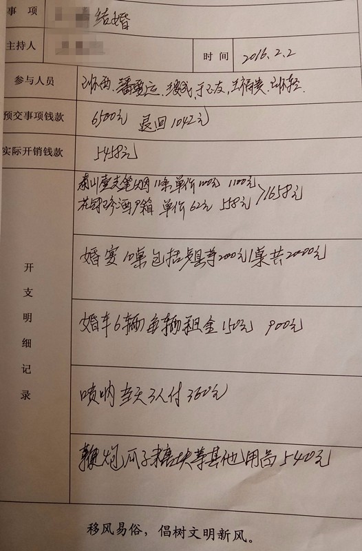 “暴风眼”调查发现,当地一些村庄红白理事会,对村民婚庆都建有专门档案,档案中详细记录了婚庆的每一笔开支明细。