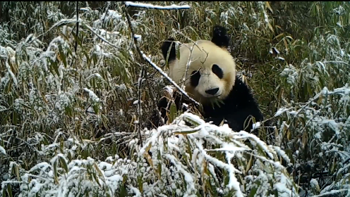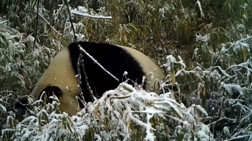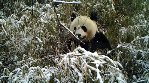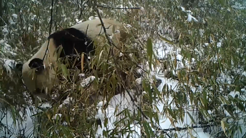 近日,大熊猫国家公园蜂桶寨片区工作人员在整理收回的红外线相机影像资料时,发现了野生“冰墩墩”在雪地进食的珍贵影像资料。