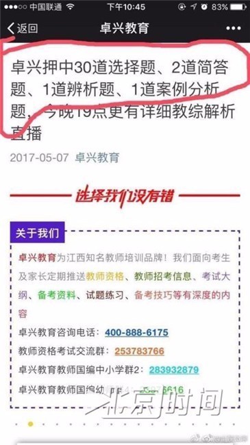 中介培训机构自称派“卧底”参加考试,第一时间掌握统考真题,配上参考答案,冠以“押题命中率”口号招揽学员。