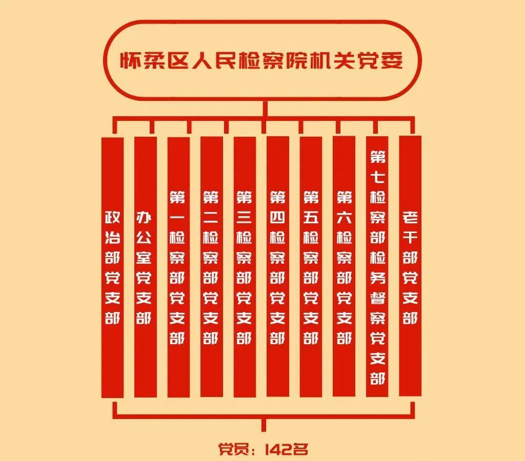 怀柔区人民检察院机关党委隶属于怀柔区委区直机关工委,下设10个党支部,共有党员142名。