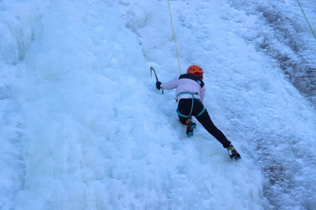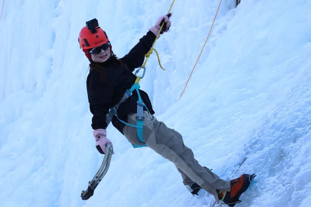 在高山攀冰体验区,不同年龄段的游客分别奔赴专业冰壁、大众体验区与儿童初学区。初学者从小心翼翼试探起步,逐渐找到节奏向上攀爬,登顶时的欢呼声此起彼伏。专业选手则动作矫健,在冰壁上灵活移动,展现出十足的力量感与技巧性。