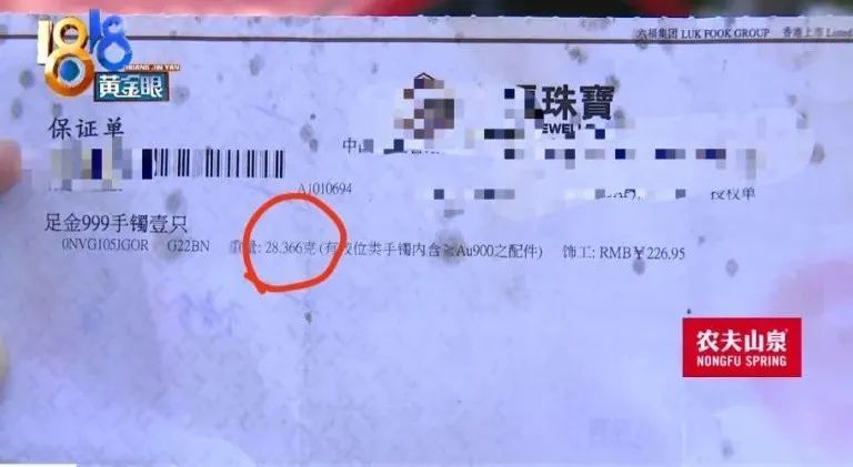 邵大姐却清晰地记得:绍兴的柜员强调过,手镯内侧是有标识的。于是她赶紧回家找发票,幸好发票还在。该品牌的发票显示,足金999手镯,重量28.366克,总价10694元。
