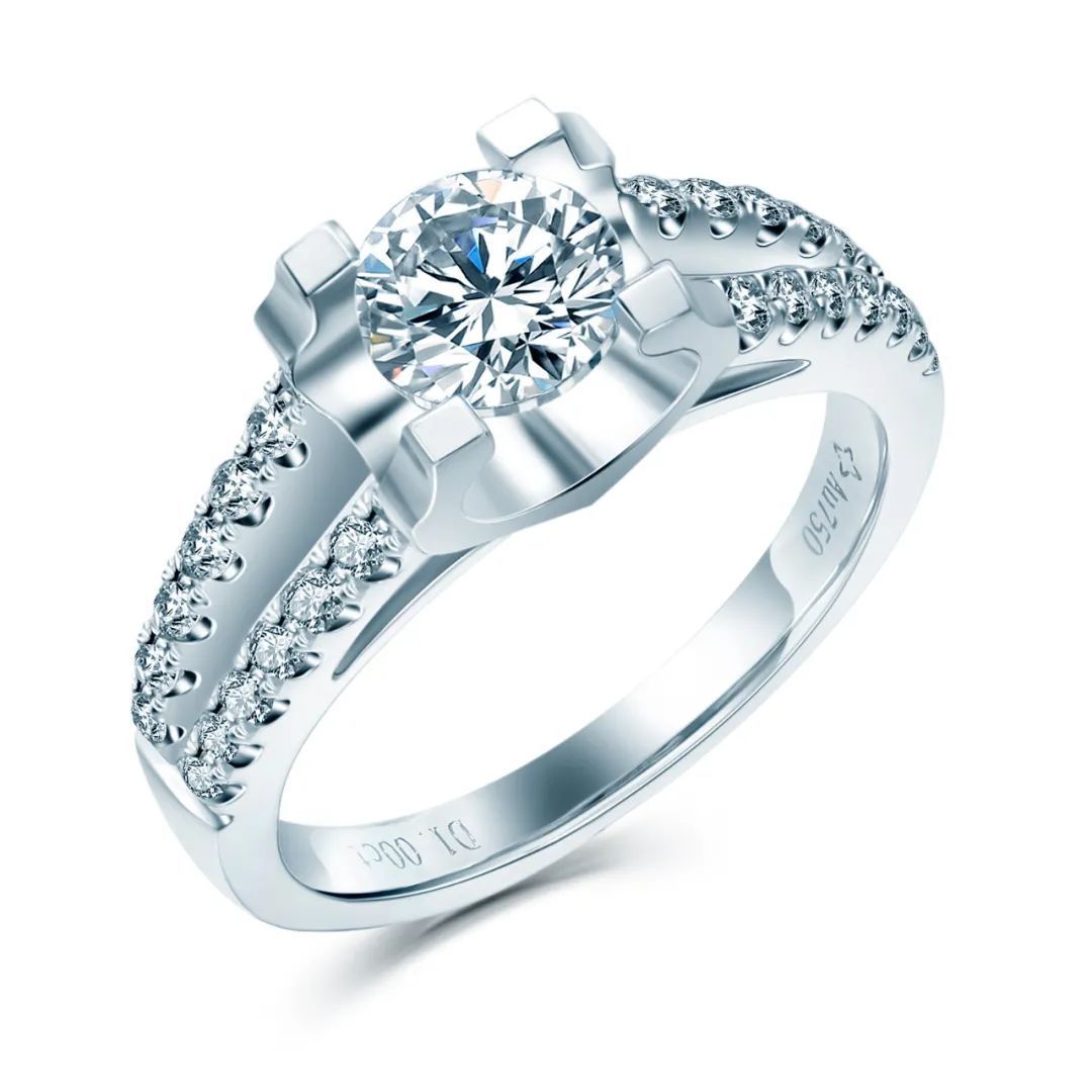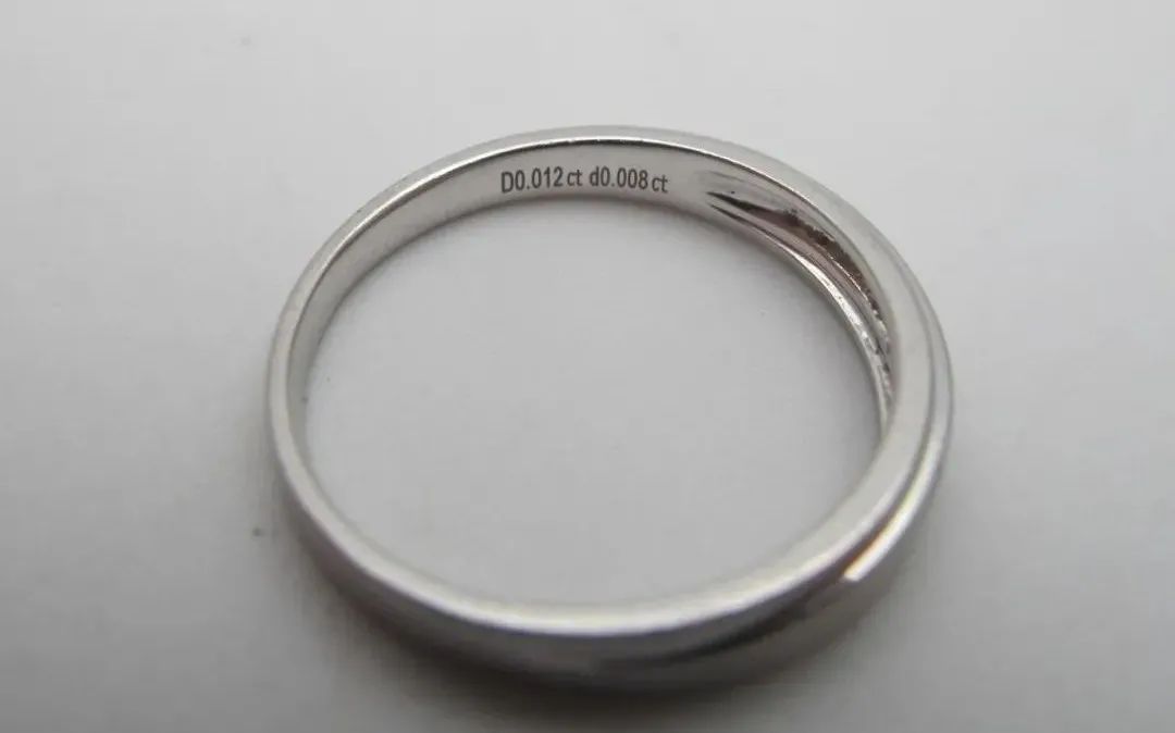 以上图钻戒为例。戒指上的ct是指重量单位“克拉”、D(包括d)是指钻石Diamond,它们是最常见的字印之一。比如一枚戒指内侧刻了D0.012ct、d0.008ct,就表示钻石主石的重量是0.012克拉,钻石配石的总重是0.008克拉。D指主石,d指配石。