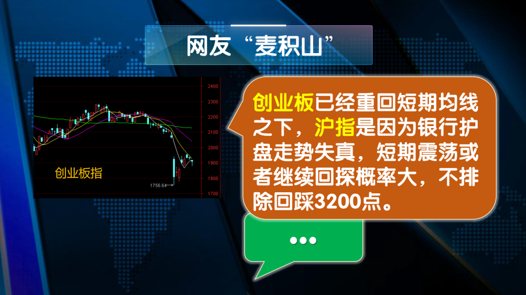 网友“麦积山”:创业板已经重回短期均线之下,沪指是因为银行护盘走势失真,短期震荡或者继续回探概率大,不排除回踩3200点。