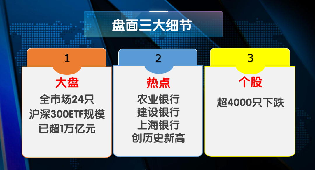 今天指数探底,盘中一度跌1%,尾盘多只沪深300ETF集体放量拉升,上证指数强势翻红,但仍有超4300只个股下跌。银行股逆势强势,农业银行等多股再创历史新高。旅游酒店、传媒、电力等板块个股走势较强。