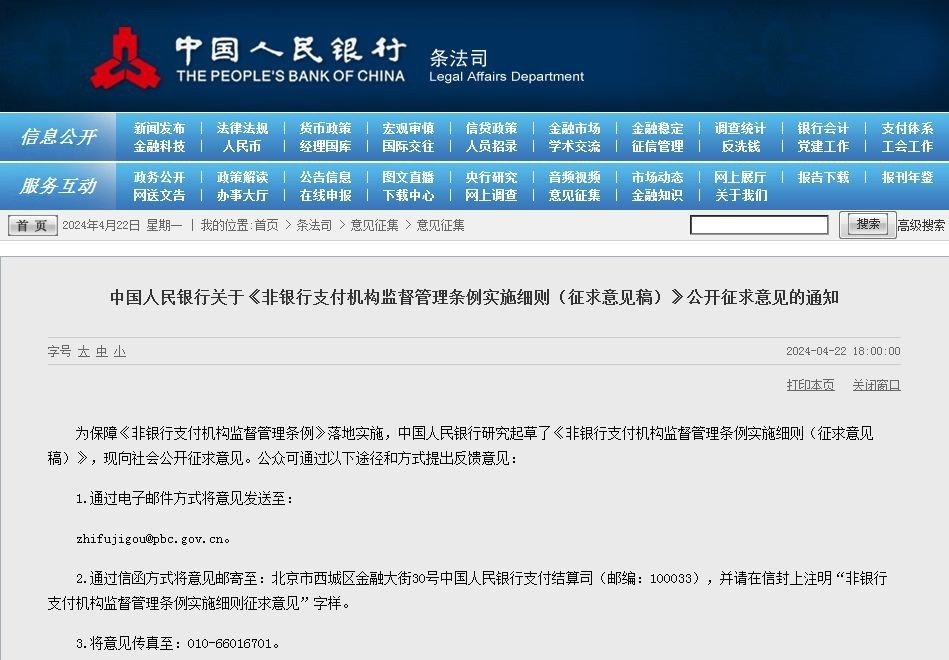 中国人民银行今天(22日)就这一条例的实施细则征求意见。