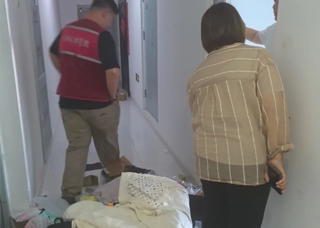 社区值班人员第一时间联合物业工作人员上门了解情况。得知该住户正在收拾房间,杂物比较多,购买的保洁服务还没过来,所以临时堆放在楼道。