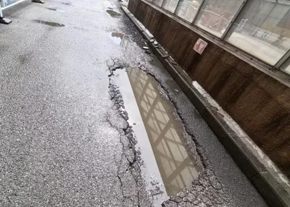 长龙家园社区南门附近路段因长期承受车辆碾压,出现大面积龟裂和凹陷。雨季来临后,积水严重,行人和车辆通行困难。