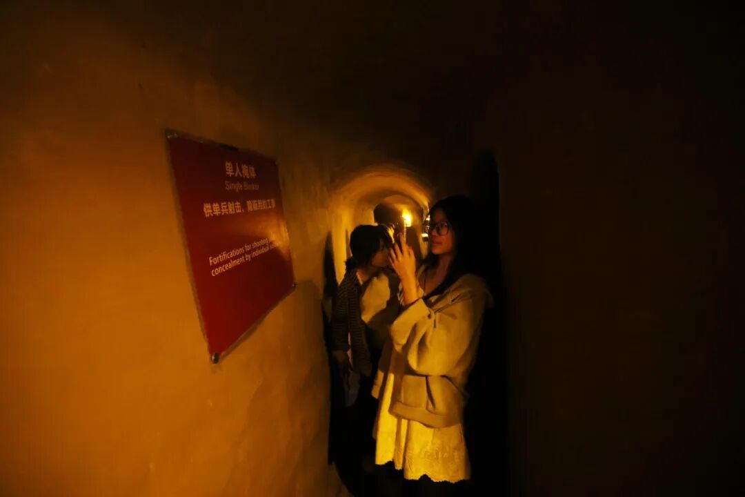 学生在地道中进行拍摄。新京报记者王贵彬 摄