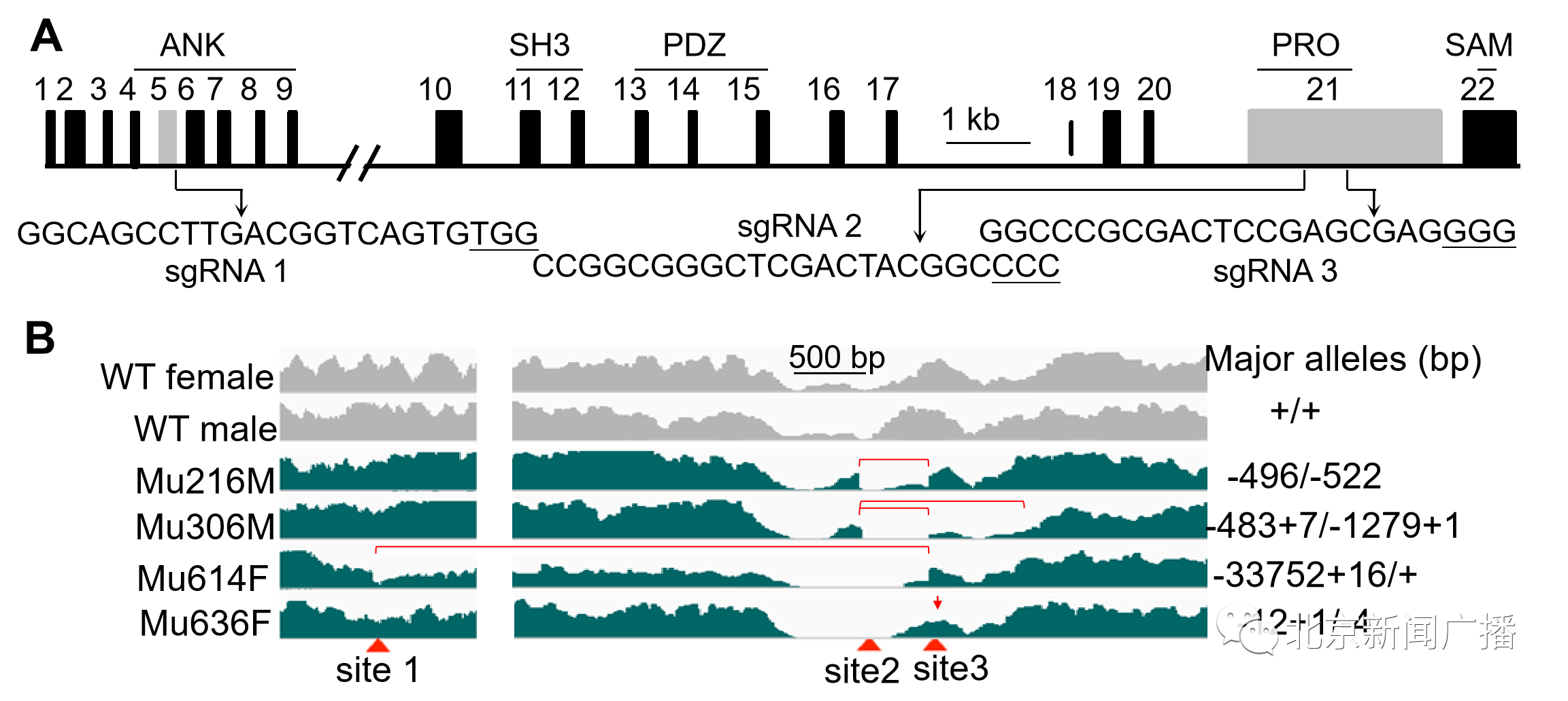 图1. CRISPR/Cas9靶向Shank3获得多个F0代突变犬