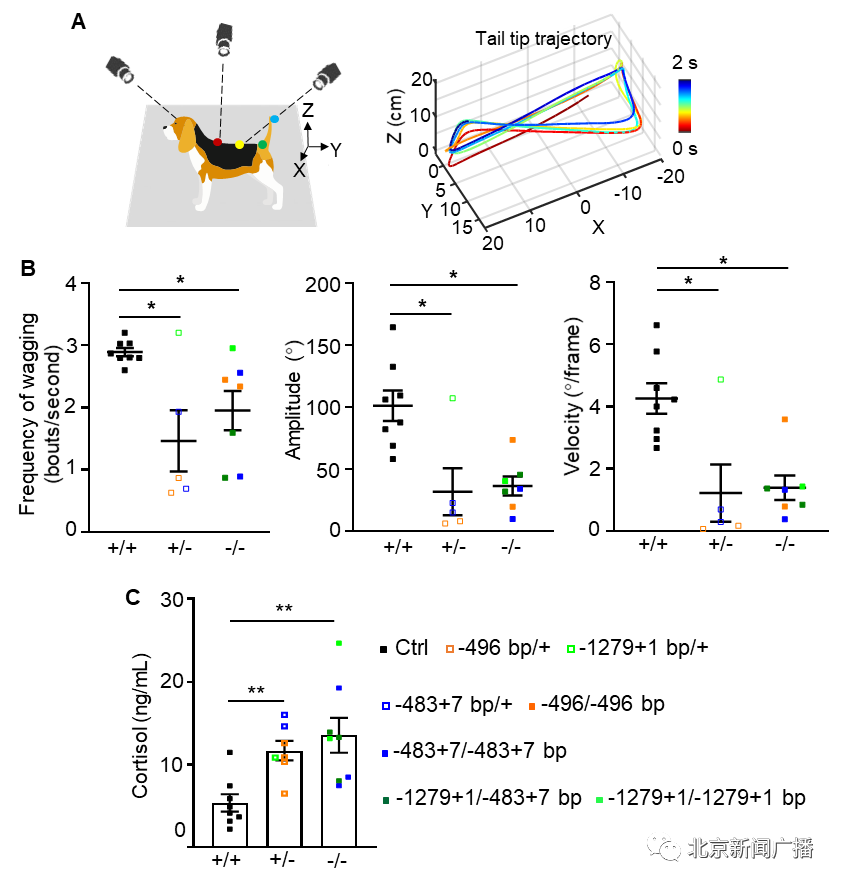 图2. 突变犬尾巴摇摆减少,血清皮质醇升高