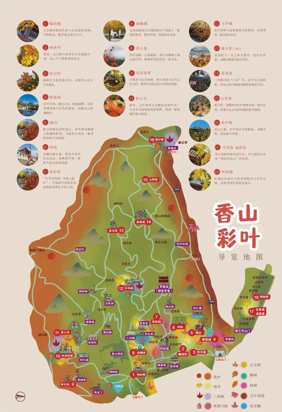 今年红叶节,公园根据不同的景观效果,甄选18处彩叶观赏点位,在地图上图文并茂的标注出来,推出“赏叶地图”,为市民游客游园赏红提供更多选择。
