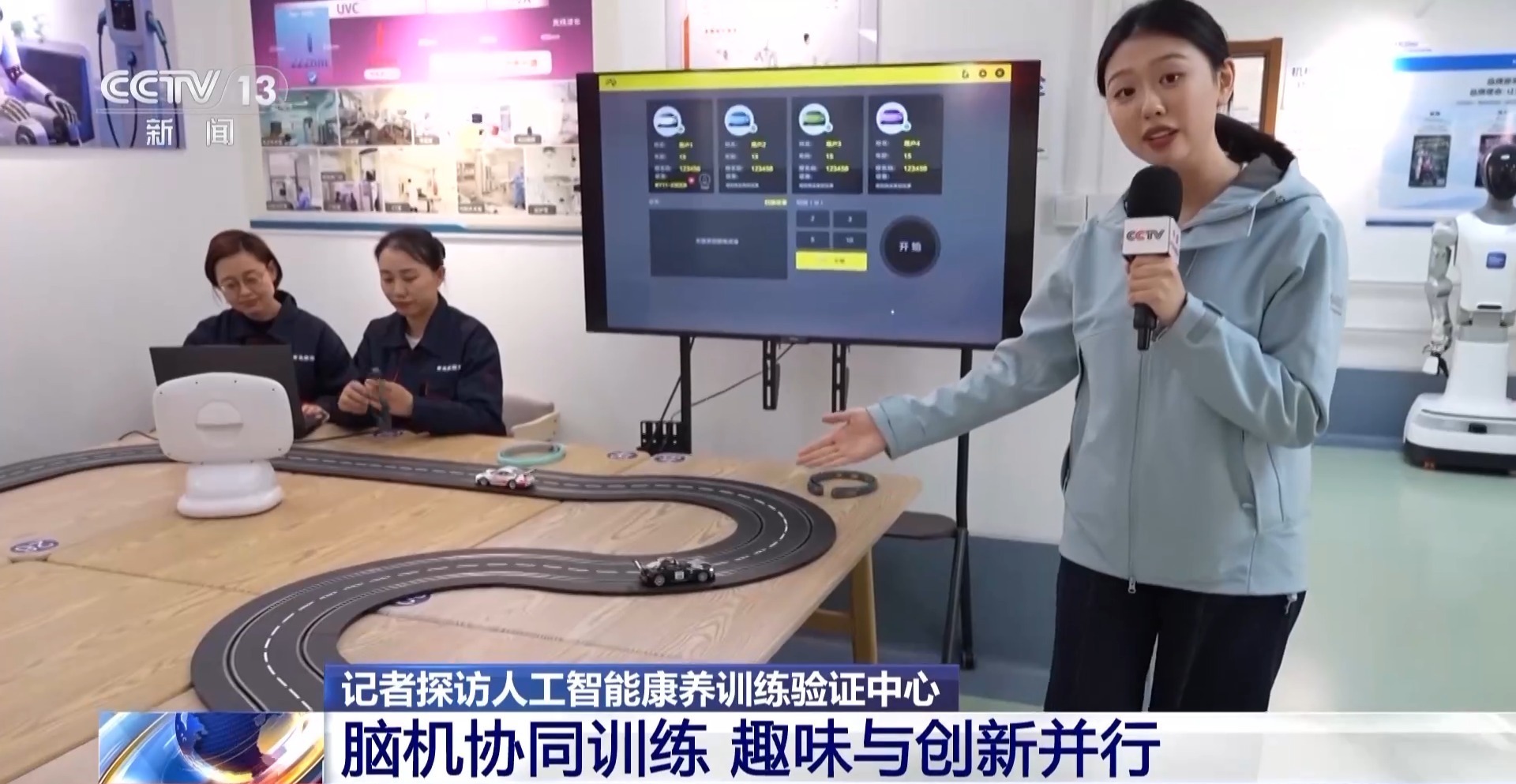 除了日常生活中的照护,康复训练也同样关键。在训练验证中心的脑机接口协同训练区,脑控小车专门帮老人等有相关需求的人群锻炼专注力,戴上非侵入式头环,里面的电极片就可以精准采集脑电信号,AI算法量化用户的专注力数值。专注度越高,小车跑的速度越快。