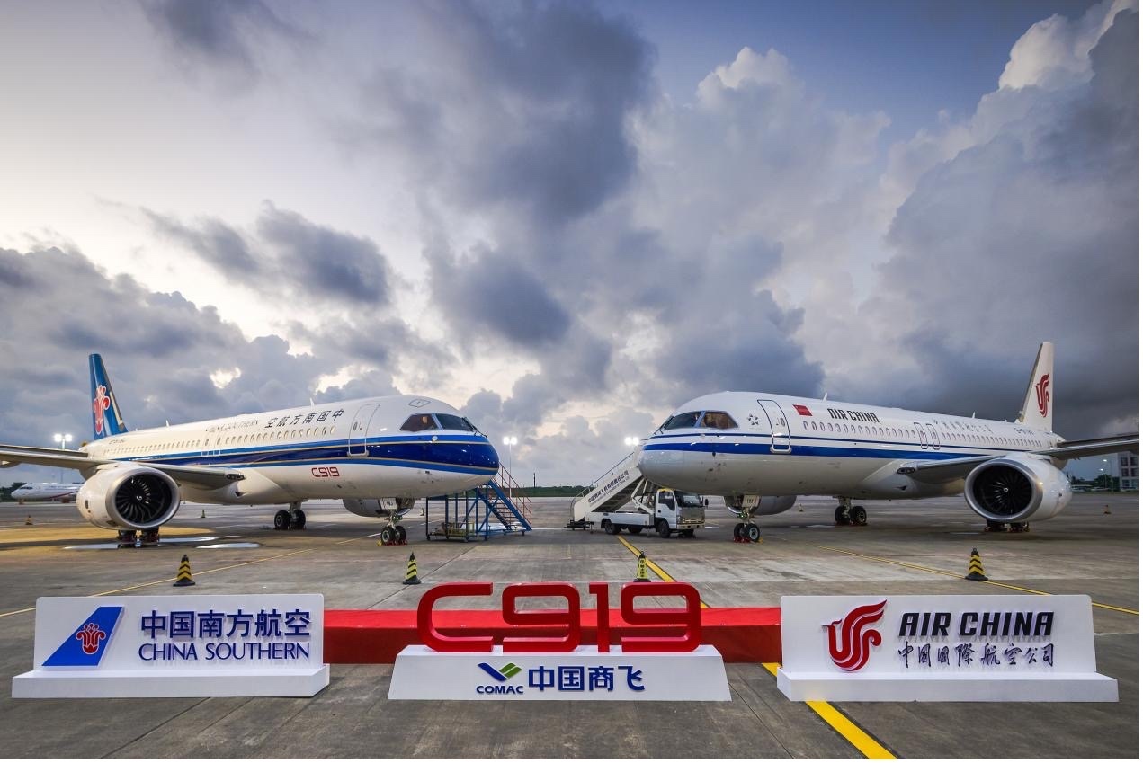 国航C919首架机为延程型,采用158座两舱布局,包含8个公务舱和150个经济舱。南航C919首架机为标准航程型,采用164座三舱布局,包含8个公务舱、18个明珠经济舱和138个经济舱。两架飞机均装配了定制化的客舱座椅等设施设备,全舱配置个人充电接口,为乘客提供便捷舒适的乘机体验。