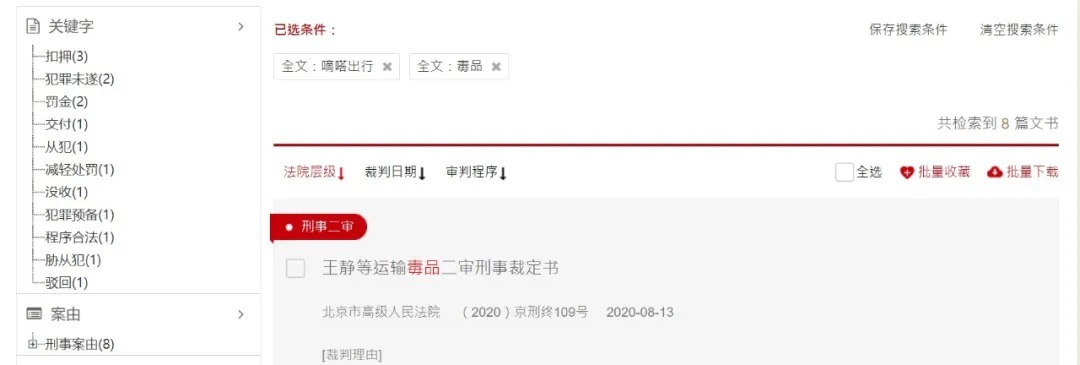 时间财经以“嘀嗒出行、毒品”为关键词检索发现,在中国裁判文书网共有8篇文书。全国乘用车市场信息联席会秘书长崔东树告诉时间财经,毒贩借助嘀嗒顺风车运输毒品,应该是嘀嗒监管不力。顺风车司机要验货,否则承担风险。